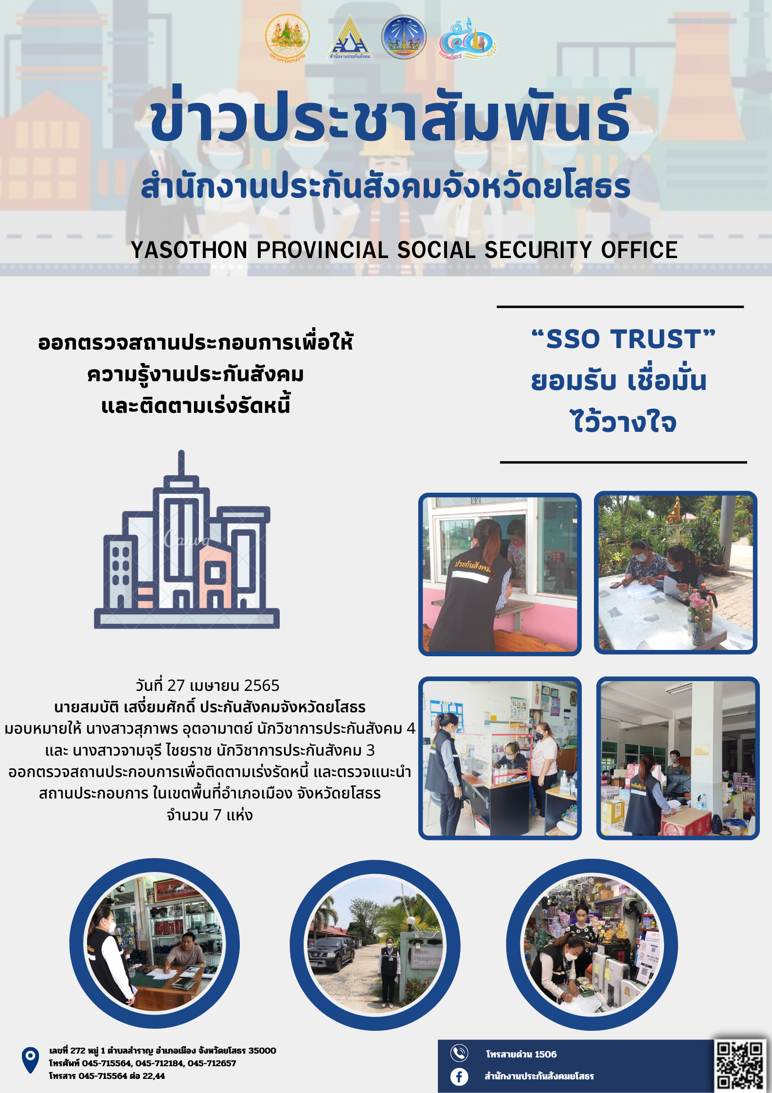 วันที่ 27 เมษายน 2565 นายสมบัติ เสงี่ยมศักดิ์ ประกันสังคมจังหวัดยโสธร มอบหมายให้ นางสาวสุภาพร อุตอามาตย์ นักวิชาการประกันสังคม 4 และ นางสาวจามจุรี ไชยราช นักวิชาการประกันสังคม 3 ออกตรวจสถานประกอบการเพื่อติดตามเร่งรัดหนี้ และตรวจแนะนำ สถานประกอบการ ใ