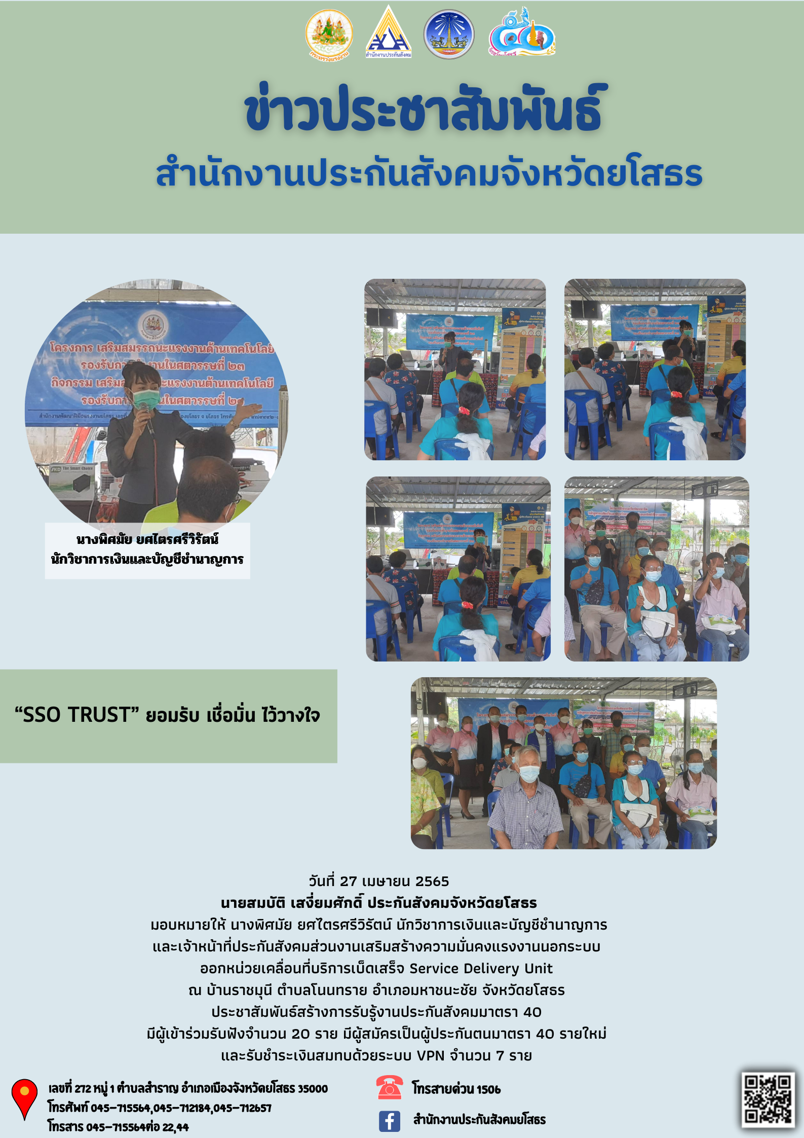 วันที่ 27 เมษายน 2565 นายสมบัติ เสงี่ยมศักดิ์ ประกันสังคมจังหวัดยโสธร มอบหมายให้ นางพิศมัย ยศไตรศรีวิรัตน์ นักวิชาการเงินและบัญชีชำนาญการ และเจ้าหน้าที่ประกันสังคมส่วนงานเสริมสร้างความมั่นคงแรงงานนอกระบบ ออกหน่วยเคลื่อนที่บริการเบ็ดเสร็จ Service D