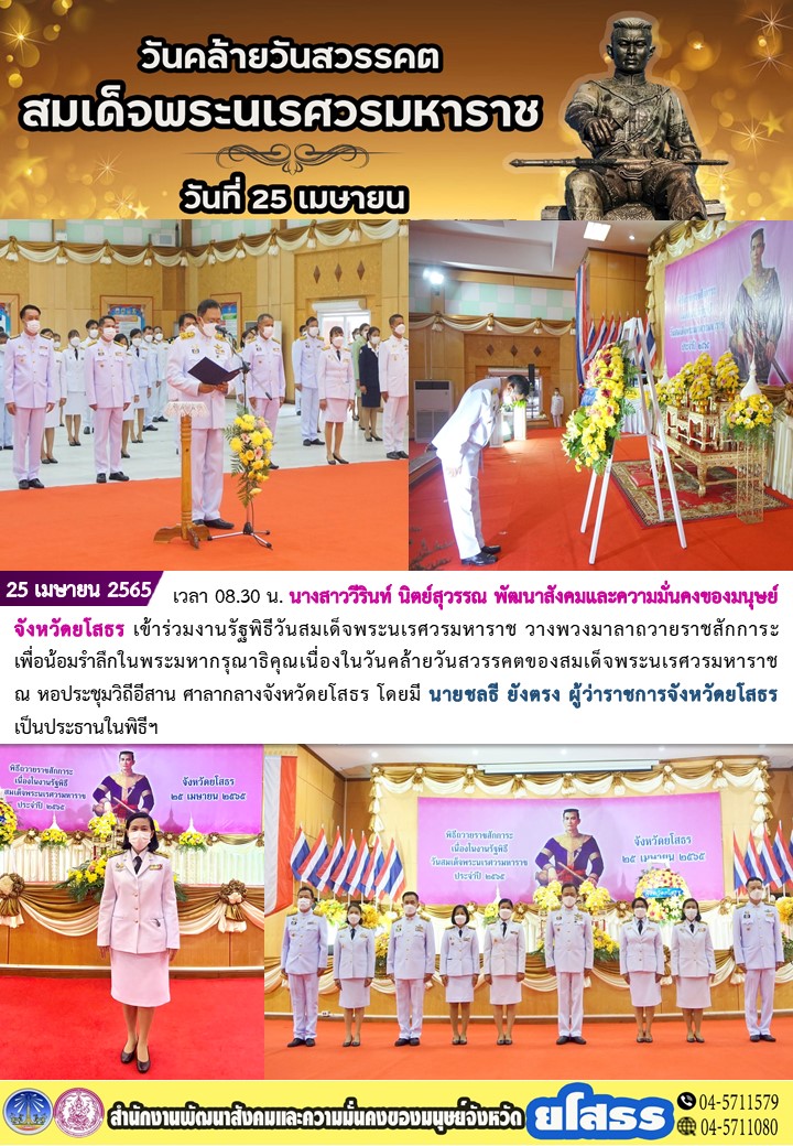 แก้ไขโดย : [สำนักงานพัฒนาสังคมและความมั่นคงของมนุษย์จังหวัดยโสธร] วันที่ 5 พ.ค. 2565 (10:09 น.)วันที่ 25 เมษายน 2565 เวลา 08.30 น. นางสาววีรินท์ นิตย์สุวรรณ พัฒนาสังคมและความมั่นคงของมนุษย์จังหวัดยโสธร เข้าร่วมงานรัฐพิธีวันสมเด็จพระนเรศวรมหาราช วางพวงมาลาถวายราชสักการะ เพื่อน้อมรำลึกในพระมหากรุณาธิคุณเนื่องในวันคล้ายวันสวรรคตของสมเด็จพระนเรศวรมหาราช ณ หอประชุมวิถีอีสาน ศาลากลางจังหวัดยโสธร โดยมี นายชลธี ยังตรง ผู้ว่าราชการจังหวัดยโสธร เป็นประธานในพิธีฯ