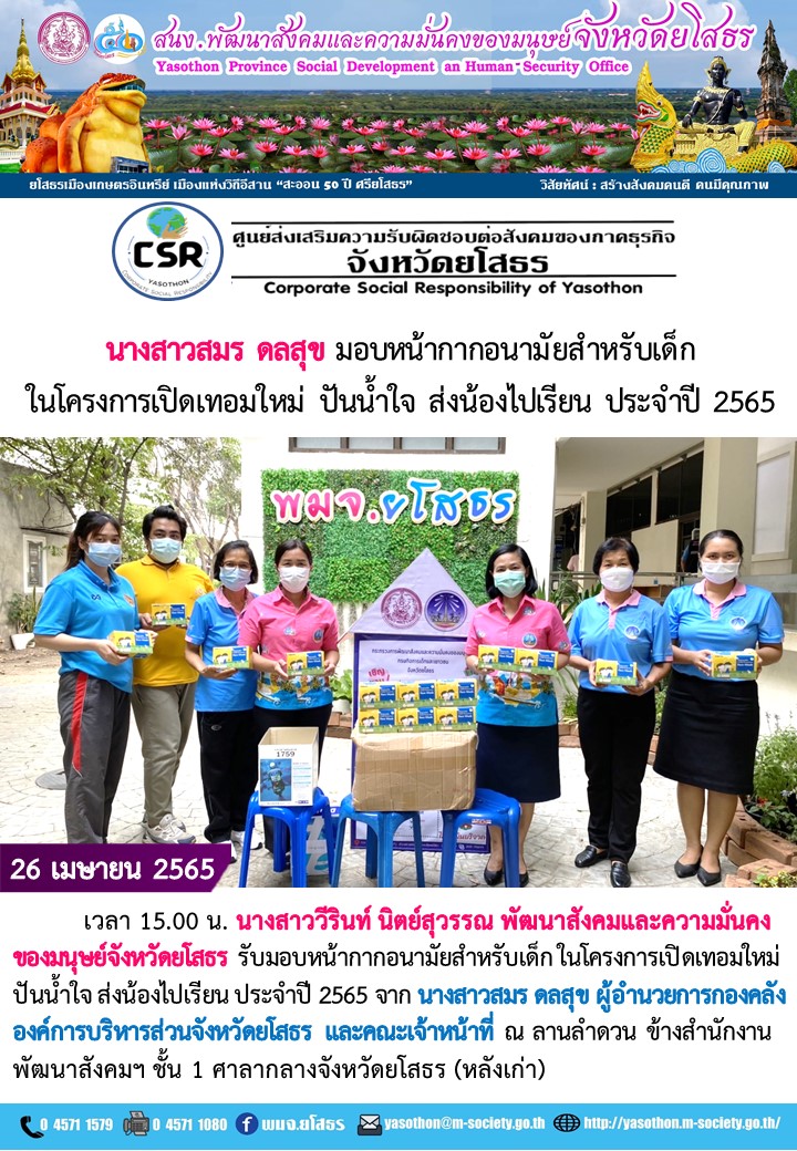 วันที่ 5 พ.ค. 2565 (10:16 น.)วันที่ 26 เมษายน 2565 เวลา 15.00 น. นางสาววีรินท์ นิตย์สุวรรณ พัฒนาสังคมและความมั่นคงของมนุษย์จังหวัดยโสธร รับมอบหน้ากากอนามัยสำหรับเด็ก ในโครงการเปิดเทอมใหม่ ปันน้ำใจ ส่งน้องไปเรียน ประจำปี 2565 จาก นางสาวสมร ดลสุข ผู้อำนวยการกองคลังองค์การบริหารส่วนจังหวัดยโสธร และคณะเจ้าหน้าที่ ณ ลานลำวน ข้างสำนักงาน