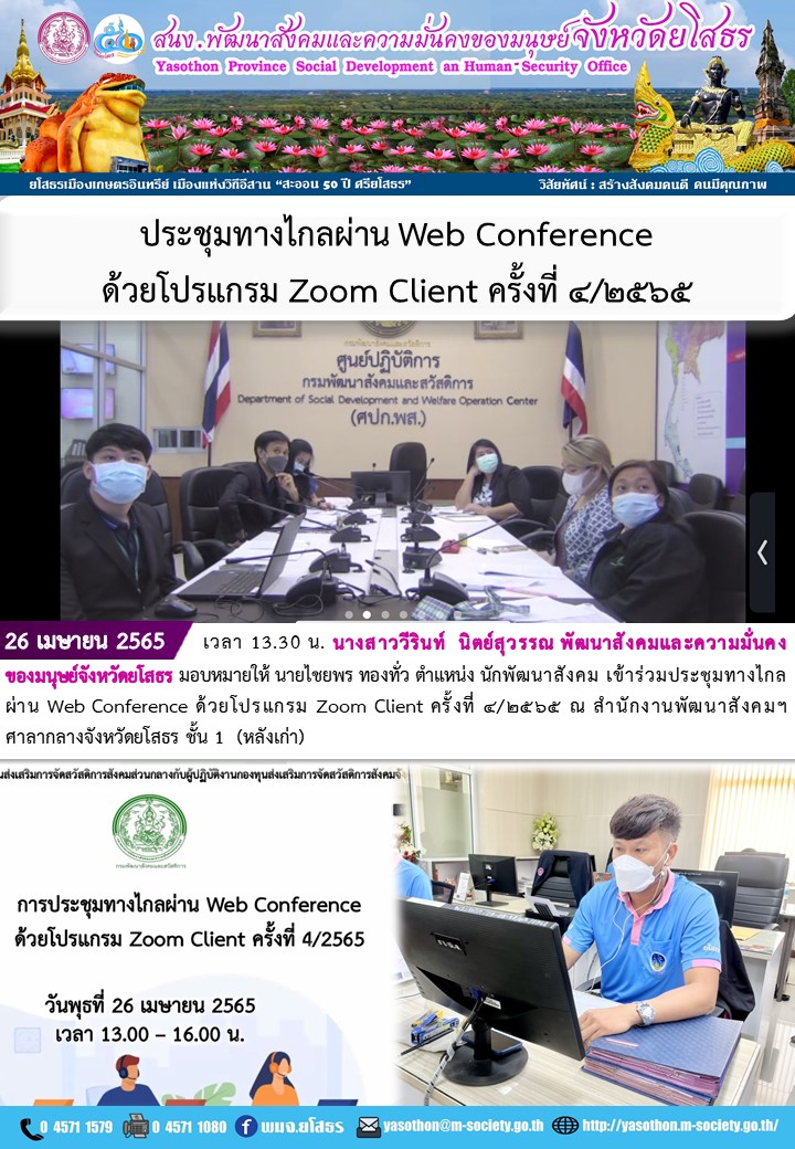 วันที่ 5 พ.ค. 2565 (10:17 น.)วันที่ 26 เมษายน 2565 เวลา 13.30 น. นางสาววีรินท์ นิตย์สุวรรณ พัฒนาสังคมและความมั่นคงของมนุษย์จังหวัดยโสธร มอบหมายให้ นายไชยพร ทองทั่ว ตำแหน่ง นักพัฒนาสังคม เข้าร่วมประชุมทางไกล ผ่าน Web Conference ด้วยโปรแกรม Zoom Client ครั้งที่ 4/2565 ณ สำนักงานพัฒนาสังคมฯ ศาลากลางจังหวัดยโสธร ชั้น 1 (หลังเก่า)