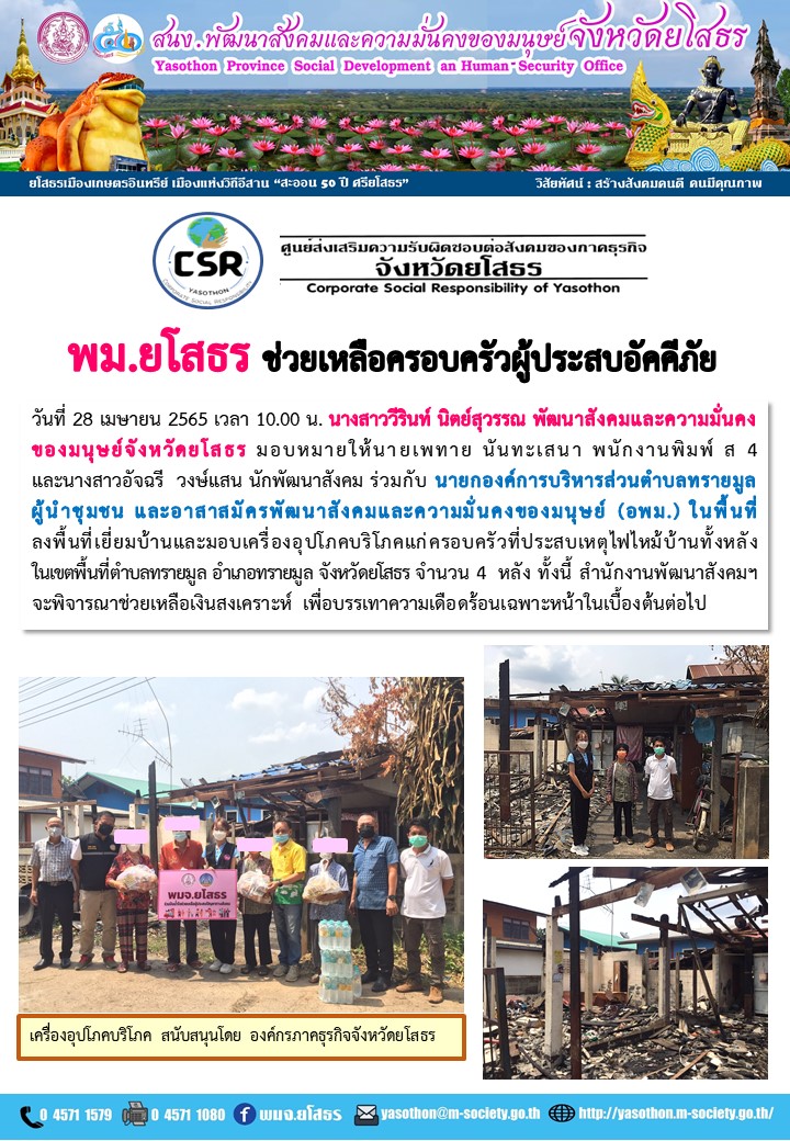 พม.ยโสธร ช่วยเหลือครอบครัวผู้ประสบอัคคีภัย (28 เมษายน 2565)