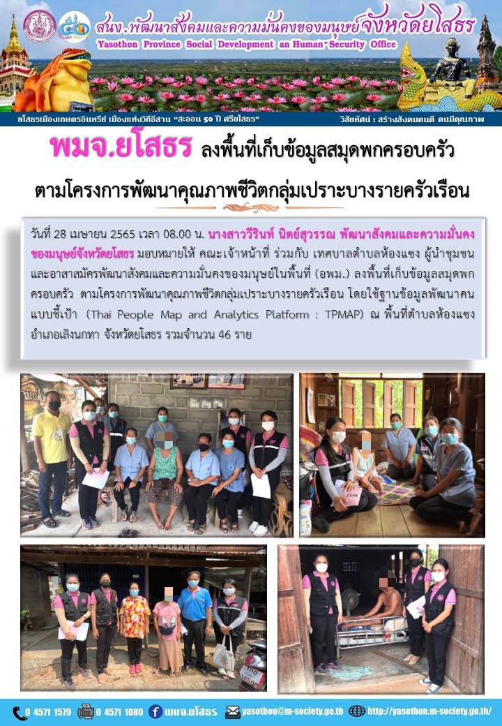 แก้ไขโดย : [สำนักงานพัฒนาสังคมและความมั่นคงของมนุษย์จังหวัดยโสธร] วันที่ 5 พ.ค. 2565 (10:50 น.)วันที่ 28 เมษายน 2565 เวลา 08.00 น. นางสาววีรินท์ นิตย์สุวรรณ พัฒนาสังคมและความมั่นคงของมนุษย์จังหวัดยโสธร มอบหมายให้ คณะเจ้าหน้าที่ ร่วมกับ เทศบาลตำบลห้องแซง ผู้นำชุมชนและอาสาสมัครพัฒนาสังคมและความมั่นคงของมนุษย์ในพื้นที่ (อพม.) ลงพื้นที่เก็บข้อมูลสมุดพกครอบครัว ตามโครงการพัฒนาคุณภาพชีวิตกลุ่มเปราะบางรายครัวเรือน โดยใช้ฐานข้อมูลพัฒนาคนแบบชี้เป้า (Thai People Map and Analytics Platform : TPMAP) ณ พื้นที่ตำบลห้องแซง อำเภอเลิงนกทา จังหวัดยโสธร รวมจำนวน 46 ราย