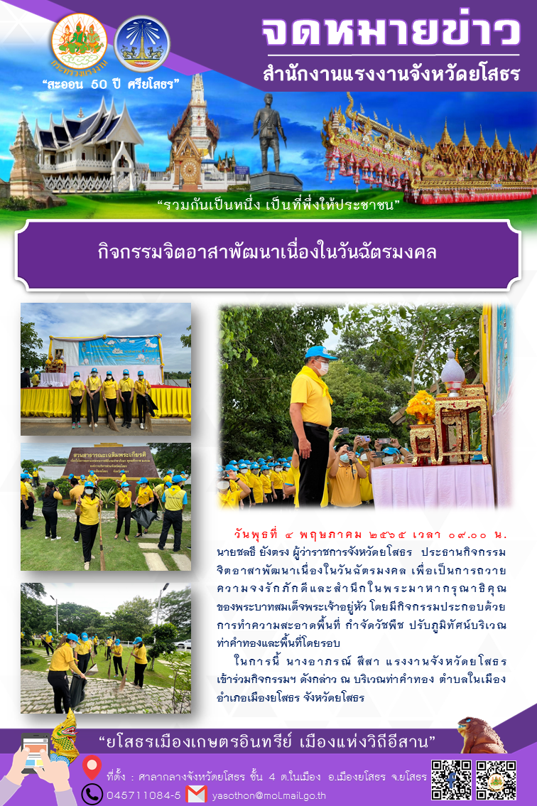 สำนักงานแรงงานจังหวัดยโสธร เข้าร่วมกิจกรรมจิตอาสาพัฒนาเนื่องในวันฉัตรมงคล เพื่อเป็นการถวายความจงรักภักดีและสำนึกในพระมหากรุณาธิคุณของพระบาทสมเด็จพระเจ้าอยูหัว