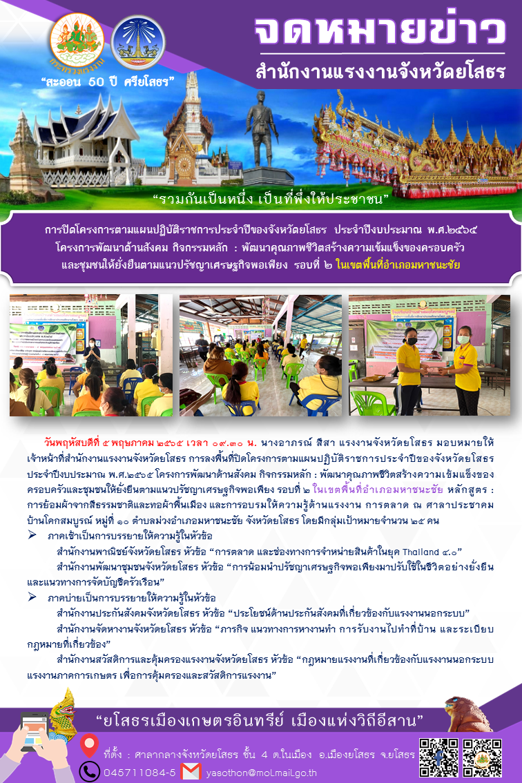 สำนักงานแรงงานจังหวัดยโสธร ลงพื้นที่ปิดโครงการตามแผนปฏิบัติราชการประจำปีของจังหวัดยโสธร ประจำปีงบประมาณ พ.ศ. 2565 โครงการพัฒนาด้านสังคม กิจกรรมหลัก : พัฒนาคุณภาพชีวิตสร้างความเข้มแข็งของครอบครัวและชุมชนให้ยั่งยืนตามแนวปรัชญาเศรษฐกิจพอเพียง