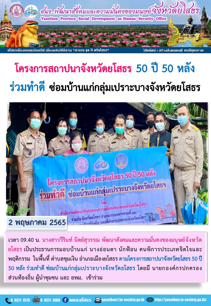 โครงการสถาปนาจังหวัดยโสธร 50 ปี 50 หลัง ร่วมทำดี ซ่อมบ้านแก่กลุ่มเปราะบางจังหวัดยโสธร (คนพิการประเภทจิตใจและพฤติกรรม) (2 พฤษภาคม 2565)