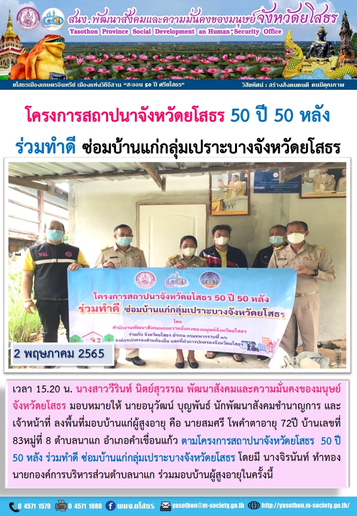 โครงการสถาปนาจังหวัดยโสธร 50 ปี 50 หลัง ร่วมทำดี ซ่อมบ้านแก่กลุ่มเปราะบางผู้สูงอายุ จังหวัดยโสธร (2 พฤษภาคม 2565)