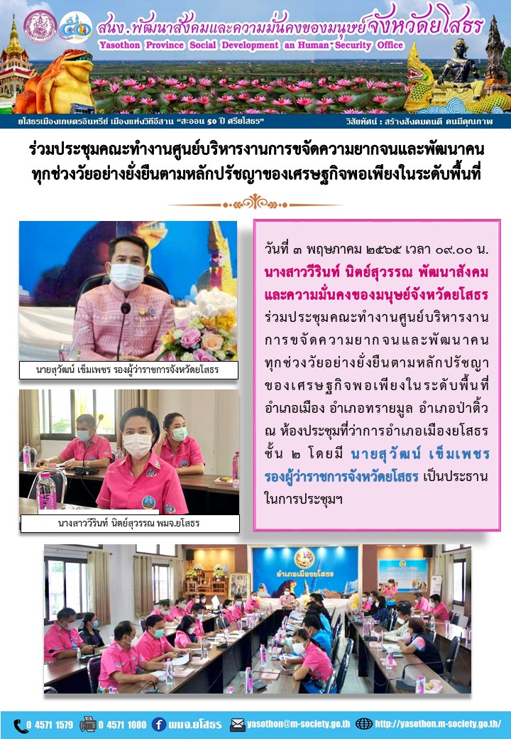 วันที่ 17 พ.ค. 2565 (20:11 น.)วันที่ 3 พฤษภาคม 2565 เวลา 09.00 น. นางสาววีรินท์ นิตย์สุวรรณ พัฒนาสังคมและความมั่นคงของมนุษย์จังหวัดยโสธร ร่วมประชุมคณะทำงานศูนย์บริหารงานการขจัดความยากจนและพัฒนาคนทุกช่วงวัยอย่างยั่งยืนตามหลักปรัชญาของเศรษฐกิจพอเพียงในระดับพื้นที่ อำเภอเมือง อำเภอทรายมูล อำเภอป่าติ้ว ณ ห้องประชุมที่ว่าการอำเภอเมืองยโสธร ชั้น 2 โดยมี นายสุวัฒน์ เข็มเพชร รองผู้ว่าราชการจังหวัดยโสธร เป็นประธานในการประชุมฯ