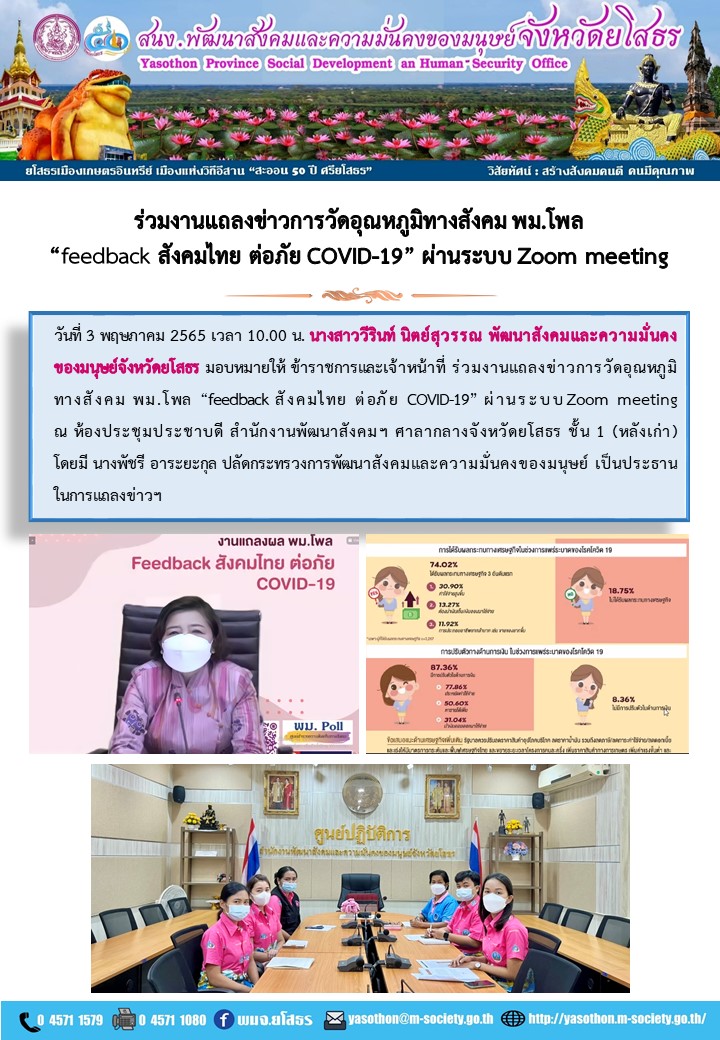 วันที่ 17 พ.ค. 2565 (20:12 น.)วันที่ 3 พฤษภาคม 2565 เวลา 10.00 น. นางสาววีรินท์ นิตย์สุวรรณ พัฒนาสังคมและความมั่นคงของมนุษย์จังหวัดยโสธร มอบหมายให้ ข้าราชการและเจ้าหน้าที่ ร่วมงานแถลงข่าวการวัดอุณหภูมิทางสังคม พม.โพล “facebook สังคมไทย ต่อภัย COVID-19” ผ่านระบบZoom meeting ณ ห้องประชุมประชาบดี สำนักงานพัฒนาสังคมฯ ศาลากลางจังหวัดยโสธร ชั้น 1 (หลังเก่า) โดยมี นางพัชรี อาระยะกุลปลัดกระทรวงการพัฒนาสังคมและความมั่นคงของมนุษย์ เป็นประธานในการประชุมฯ