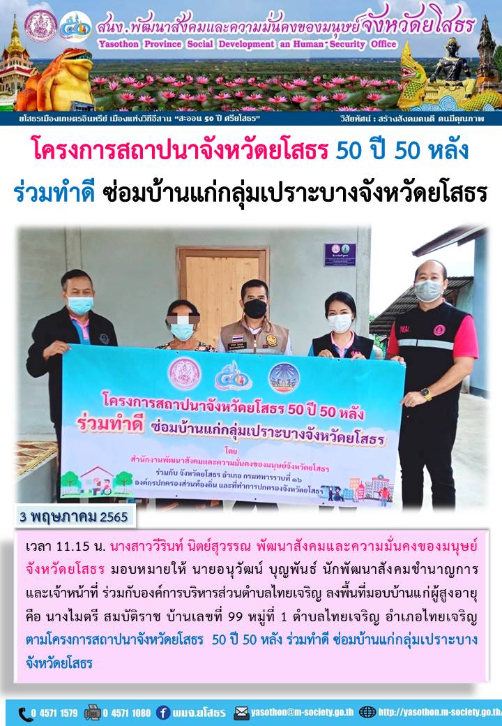 โครงการสถาปนาจังหวัดยโสธร 50 ปี 50 หลัง ร่วมทำดี ซ่อมบ้านแก่กลุ่มเปราะบางผู้สูงอายุ ตำบลไทยเจริญ อำเภอไทยเจริญ. (3 พฤษภาคม 2565)