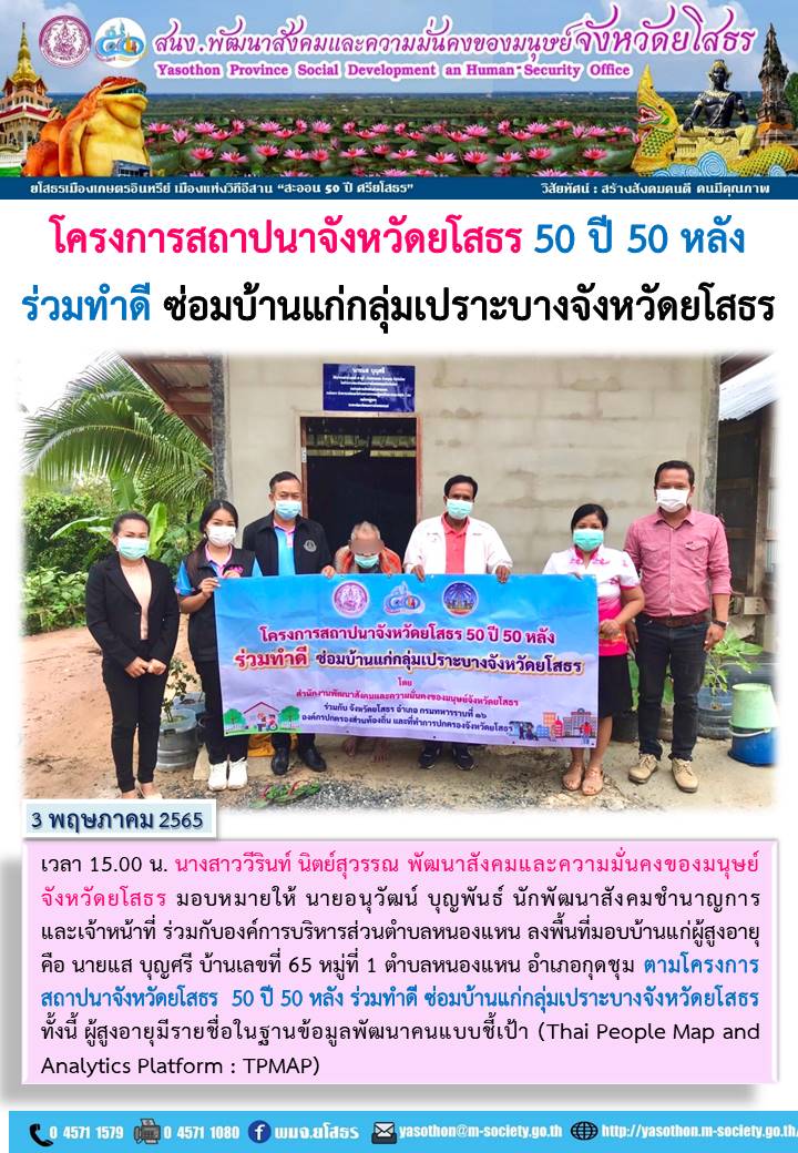 วันที่ 17 พ.ค. 2565 (20:37 น.)วันที่ 3 พฤษภาคม 2565 เวลา 15.00 น. นางสาววีรินท์ นิตย์สุวรรณ พัฒนาสังคมและความมั่นคงของมนุษย์จังหวัดยโสธร มอบหมายให้ นายอนุวัฒน์ บุญพันธ์ นักพัฒนาสังคมชำนาญการ และเจ้าหน้าที่ ร่วมกับองค์การบริหารส่วนตำบลหนองแหน ลงพื้นที่มอบบ้านแก่ผู้สูงอายุ ตำบลหนองแหน อำเภอกุดชุม ตามโครงการสถาปนาจังหวัดยโสธร 50 ปี 50 หลัง ร่วมทำดี ซ่อมบ้านแก่กลุ่มเปราะบางจังหวัดยโสธร ทั้งนี้ ผู้สูงอายุมีรายชื่อในฐานข้อมูลพัฒนาคนแบบชี้เป๊า (Thai People Map and Analytics Platform : TPMAP)