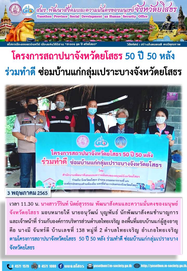 โครงการสถาปนาจังหวัดยโสธร 50 ปี 50 หลัง ร่วมทำดี ซ่อมบ้านแก่กลุ่มเปราะบาง ตำบลไทยเจริญ อำเภอไทยเจริญ. (3 พฤษภาคม 2565)