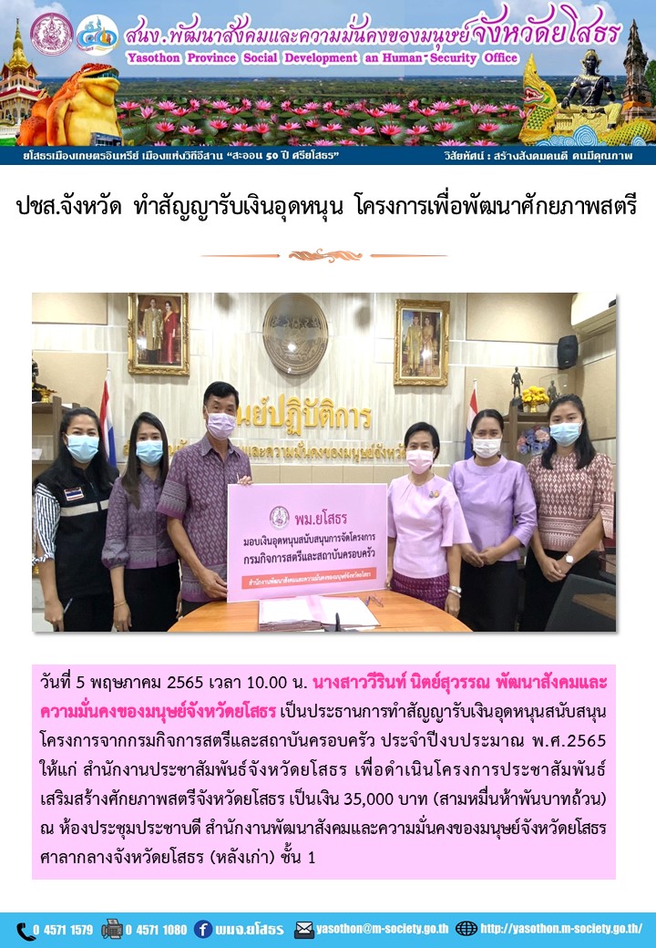 วันที่ 17 พ.ค. 2565 (20:56 น.)วันที่ 5 พฤษภาคม 2565 เวลา 10.00 น. นางสาววีรินท์ นิตย์สุวรรณ พัฒนาสังคมและความมั่นคงของมนุษย์จังหวัดยโสธร เป็นประธานการทำสัญญารับเงินอุดหนุนสนับสนุนโครงการจากกรมกิจการสตรีและสถาบันครอบครัว ประจำปีงบประมาณ พ.ศ.2565 ให้แก่ สำนักงานประชาสัมพันธ์จังหวัดยโสธร เพื่อดำเนินโครงการประชาสัมพันธ์เสริมสร้างศักยภาพสตรีจังหวัดยโสธร เป็นเงิน 35,000 บาท (สามหมื่นห้าพันบาทถ้วน) ณ ห้องประชุมประชาบดี สำนักงานพัฒนาสังคมและความมั่นคงของมนุษย์จังหวัดยโสธร ศาลากลางจังหวัดยโสธร (หลังเก่า) ชั้น 1