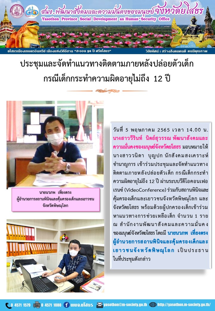 วันที่ 17 พ.ค. 2565 (21:02 น.)วันที่ 5 พฤษภาคม 2565 เวลา 14.00 น. นางสาววีรินท์ นิตย์สุวรรณ พัฒนาสังคมและความมั่นคงของมนุษย์จังหวัดยโสธร มอบหมายให้ นางสาววนิดา บุญปก นักสังคมสงเคราะห์ชำนาญการ เข้าร่วมประชุมและจัดทำแนวทางติดตามภายหลังปล่อยตัวเด็ก กรณีเด็กกระทำความผิดอายุไม่ถึง 12 ปี ผ่านระบบวีดีโอคอนเฟอเรนซ์ (VideoConference) ร่วมกับสถานพินิจและคุ้มครองเด็กและเยาวชนจังหวัดพิษณุโลก และจังหวัดยโสธร พร้อมด้วยผู้ปกครองเด็กเข้าร่วมหาแนวทางการช่วยเหลือเด็ก จำนวน 1 ราย ณ สำนักงานพัฒนาสังคมและความมั่นคงของมนุษย์จังหวัดยโสธร โดยมี นายนวภพ เที่ยงตรง ผู้อำนวยการสถานฟินิจและคุ้มครองเด็กและเยาวชนจังหวัดพิษณุโลก เป็นประธานในที่ประชุมดังกล่าว