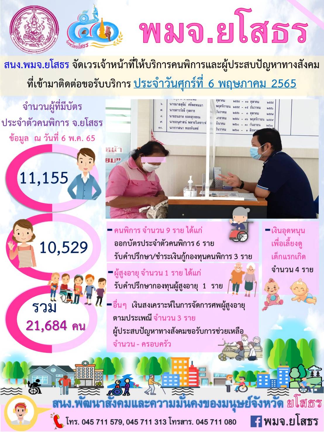 สนง.พมจ.ยโสธร จัดเวรเจ้าหน้าที่ให้บริการคนพิการและผู้ประสบปัญหาทางสังคม ที่เข้ามาติดต่อขอรับบริการ (6 พฤษภาคม 2565)