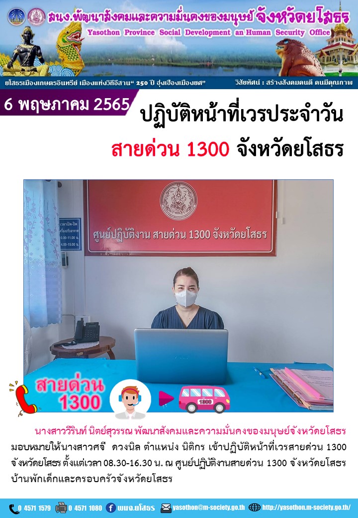 ปฏิบัติหน้าที่เวรประจำวันสายด่วน 1300 จังหวัดยโสธร (6 พฤษภาคม 2565)