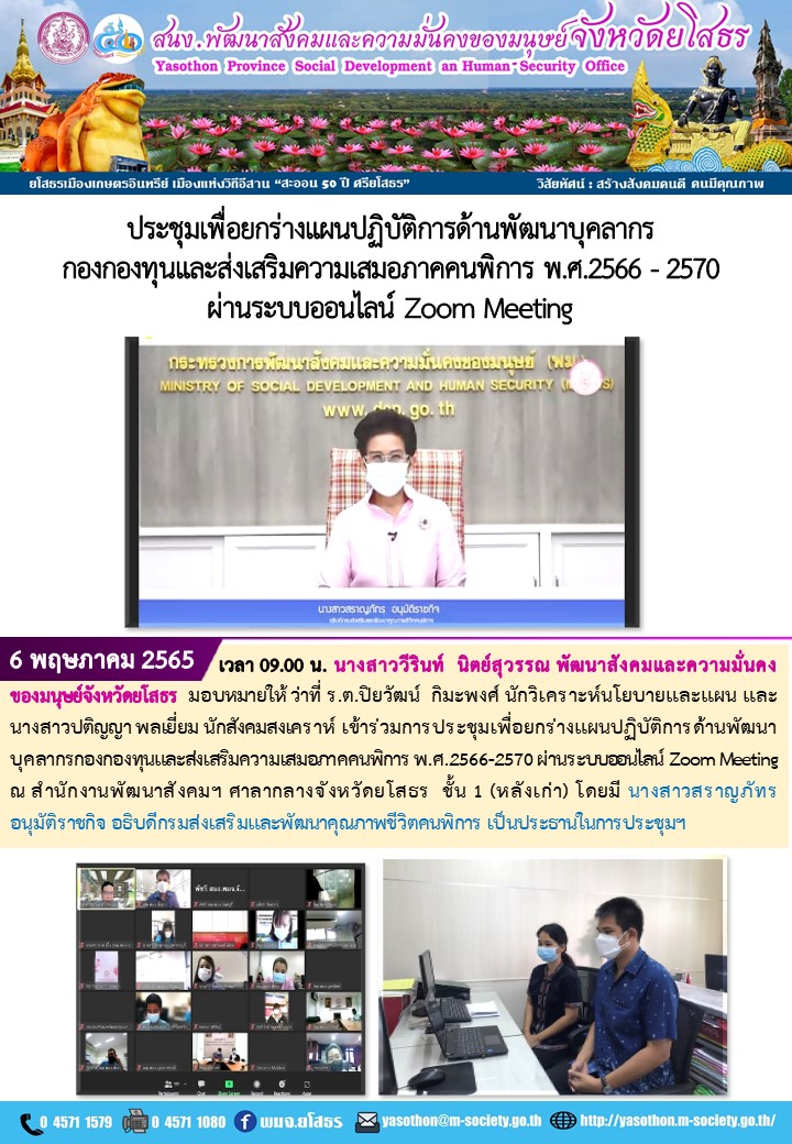 วันที่ 17 พ.ค. 2565 (21:07 น.)วันที่ 6 พฤษภาคม 2565 เวลา 09.00 น. นางสาววีรินท์ นิตย์สุวรรณ พัฒนาสังคมและความมั่นคงของมนุษย์จังหวัดยโสธร มอบหมายให้ ว่าที่ ร.ต.ปิยวัฒน์ กิมะพงศ์ นักวิเคราะห์นโยบายและแผน และนางสาวปติญญา พลเยี่ยม นักสังคมสงเคราห์ เข้าร่วมการประชุมเพื่อยกร่างแผนปฏิบัติการด้านพัฒนาบุคลากรกองกองทุนและส่งเสริมความเสมอภาคคนพิการ พ.ศ.2566-2570 ผ่านระบบออนไลน์ Zoom Meeting ณ สำนักงานพัฒนาสังคมฯ ศาลากลางจังหวัดยโสธร ชั้น 1 (หลังเก่า) โดยมี นางสาวสราญภัทร อนุมัติราชกิจ อธิบดีกรมส่งเสริมและพัฒนาคุณภาพชีวิตคนพิการ เป็นประธานในการประชุมฯ