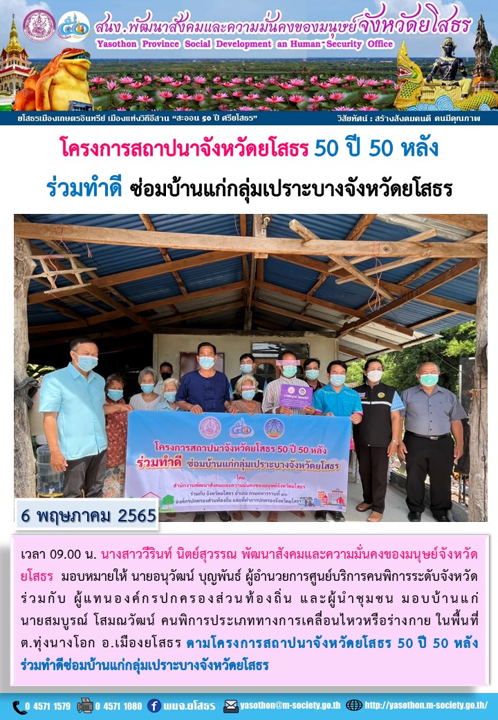 โครงการสถาปนาจังหวัดยโสธร 50 ปี 50 หลัง ร่วมทำดี ซ่อมบ้านแก่กลุ่มเปราะบางพื้นที่ ตำบลทุ่งนางโอก อำเภอเมืองยโสธร (6 พฤษภาคม 2565)
