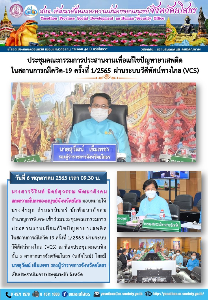 วันที่ 17 พ.ค. 2565 (21:22 น.)วันที่ 6 พฤษภาคม 2565 เวลา 09.30 น. นางสาววีรินท์ นิตย์สุวรรณ พัฒนาสังคมและความมั่นคงของมนุษย์จังหวัดยโสธ มอบหมายให้นางคำมุก ด่านธานินทร์ นักพัฒนาสังคมชำนาญการพิเศษ เข้าร่วมประชุมคณะกรรมการประสานงานเพื่อแก้ไขปัญหายาเสพติดในสถานการณ์โควิด-19 ครั้งที่ 1/2565 ผ่านระบบวีดีทัศน์ทางไกล (VCS) ณ ห้องประชุมหมอนขิด ชั้น 2 ศาลากลางจังหวัดยโสธร (หลังใหม่) โดยมีนายสุวัฒน์ เข็มเพชร รองผู้ว่าราชการจังหวัดยโสธร เป็นประธานในการประชุมระดับจังหวัด