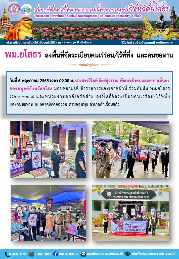 พม.ยโสธร ลงพื้นที่จัดระเบียบคนเร่ร่อน/ไร้ที่พึ่ง และคนขอทาน (6 พฤษภาคม 2565)