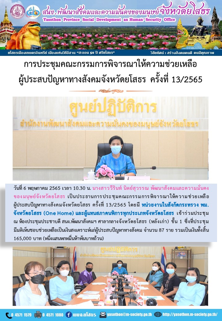 ประชุมคณะกรรมการพิจารณาให้ความช่วยเหลือผู้ประสบปัญหาทางสังคมจังหวัดยโสธร ครั้งที่ 13/2565 (6 พฤษภาคม 2565)