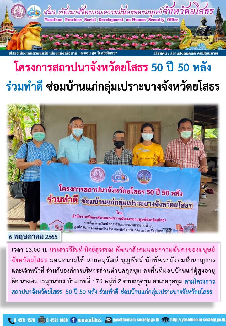 โครงการสถาปนาจังหวัดยโสธร 50 ปี 50 หลัง ร่วมทำดี ซ่อมบ้านแก่กลุ่มเปราะบางพื้นที่ ตำบลกุดชุม อำเภอกุดชุม (6 พฤษภาคม 2565)