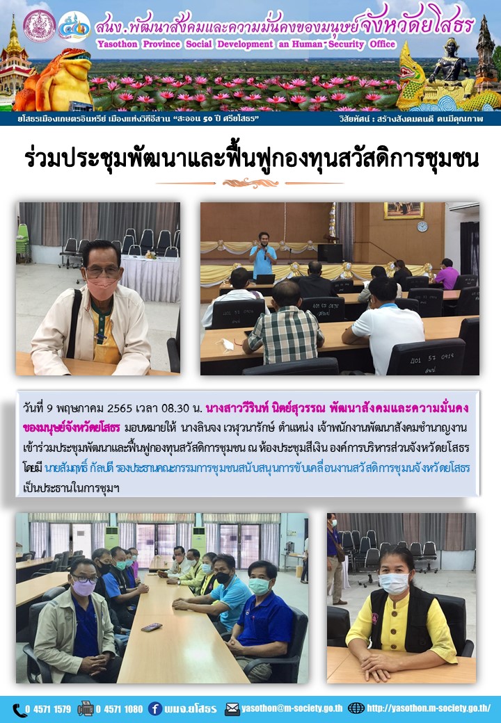 วันที่ 17 พ.ค. 2565 (22:05 น.)วันที่ 9 พฤษภาคม 2565 เวลา 08.30 น. นางสาววีรินท์ นิตย์สุวรรณ พัฒนาสังคมและความมั่นคง ของมนุษย์จังหวัดยโสธร มอบหมายให้ นางลินจง เวฬุวนารักษ์ ตำแหน่ง เจ้าพนักงานพัฒนาสังคมชำนาญงาน เข้าร่วมประชุมพัฒนาและฟื้นฟูกองทุนสวัสดิการชุมชน ณ ห้องประชุมสีเงิน องค์การบริหารส่วนจังหวัดยโสธร โดยมี นายสัมฤทธิ์ กัลปดี รองประธานคณะกรรมการชุมชนสนับสนุนการขับเคลื่อนงานสวัสดิการชุมนจังหวัดยโสธร เป็นประธานในการชุมฯ