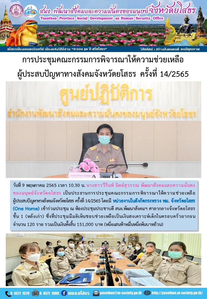 ประชุมคณะกรรมการพิจารณาให้ความช่วยเหลือผู้ประสบปัญหาทงสังคมจังหวัดยโสธร ครั้งที่ 14/2565 (9 พฤษภาคม 2565)