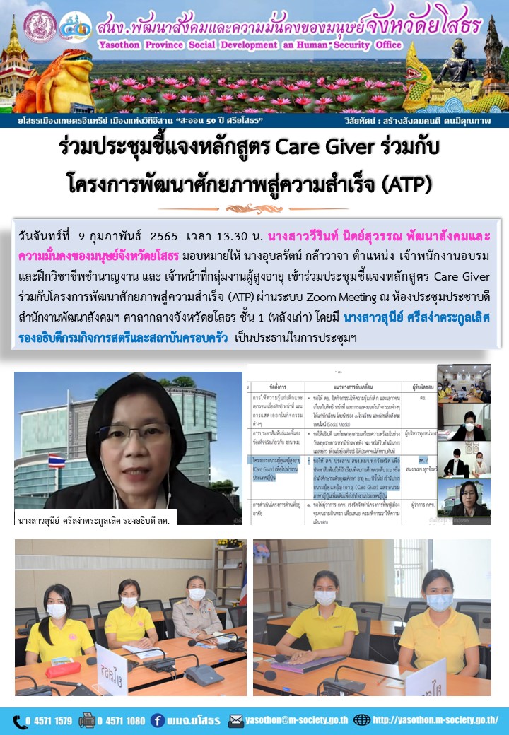 วันที่ 17 พ.ค. 2565 (22:08 น.)วันจันทร์ที่ 9 กุมภาพันธ์ 2565 เวลา 13.30 น. นางสาววีรินท์ นิตย์สุวรรณ พัฒนาสังคมและความมั่นคงของมนุษย์จังหวัดย์โสธร มอบหมายให้ นางอุบลรัตน์ กล้าวาจา ตำแหน่ง เจ้าพนักงานอบรมและฝึกวิชาชีพชำนาญงาน และ เจ้าหน้าที่กลุ่มงานผู้สูงอายุ เข้าร่วมประชุมชี้แจงหลักสูตร Care Giver ร่วมกับโครงการพัฒนาศักยภาพสู่ความสำเร็จ (ATP) ผ่านระบบ Zoon Meeting ณ ห้องประชุมประชาบดี สำนักงานพัฒนาสังคมฯ ศาลากลางจังหวัดยโสธร ชั้น 1 (หลังเก่า โดยมี นางสาวสุนีย์ ศรีสง่ตระกูลเลิศ รองอธิบดีกรมกิจการสตรีและสถาบันครอบครัว เป็นประธานในการประชุมฯ