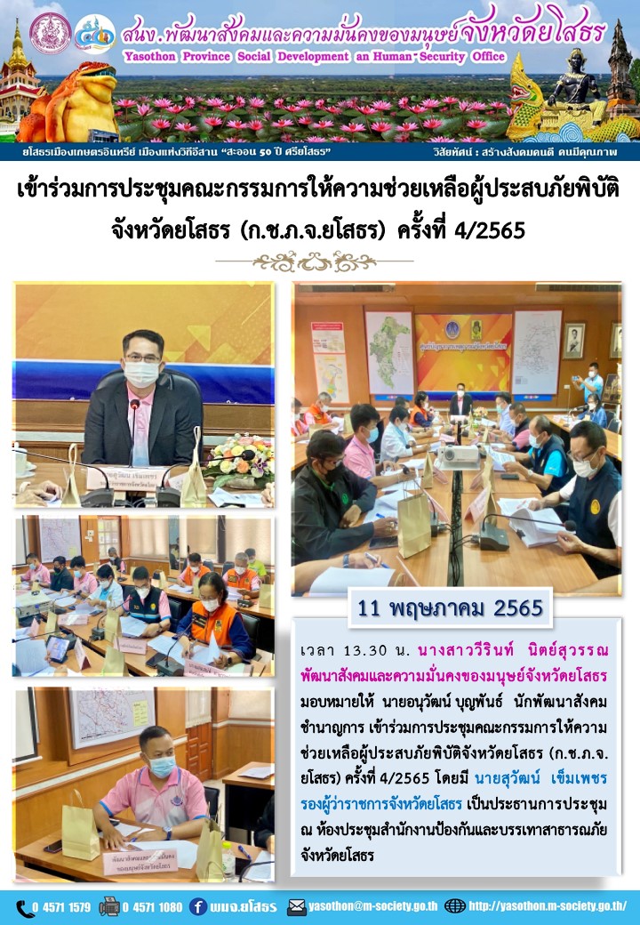 เข้าร่วมการประชุมคณะกรรมการให้ความช่วยเหลือผู้ประสบภัยพิบัติจังหวัดยโสธร (ก.ช.ภ.จ.ยโสธร) ครั้งที่ 4/2565 (11 พฤษภาคม 2565)