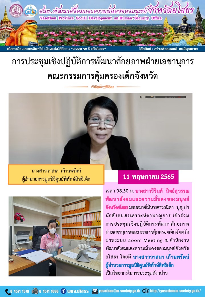 วันที่ 17 พ.ค. 2565 (22:42 น.)วันที่ 11 พฤษภาคม 2565 เวลา 08.30 น. นางสาววีรินท์ นิตย์สุวรรณ พัฒนาสังคมและความมั่นคงของมนุษย์จังหวัดยโสธร มอบหมายให้นางสาววนิดา บุญปก นักสังคมสงเคราะห์ชำนาญการ เข้าร่วม การประชุมเชิงปฏิบัติการพัฒนาศักยภาพ ฝ่ายเลขานุการคณะกรรมการคุ้มครองเด็กจังหวัด ผ่านระบบ Zoom Meeting ณ สำนักงานพัฒนาสังคมและความมั่นคงของมนุษย์จังหวัดยโสธร โดยมี นางสาววาสนา เก้านพรัตน์ ผู้อำนวยการมูลนิธิศูนย์พิทักษ์สิทธิเด็ก เป็นวิทยากรในการประชุมดังกล่าว