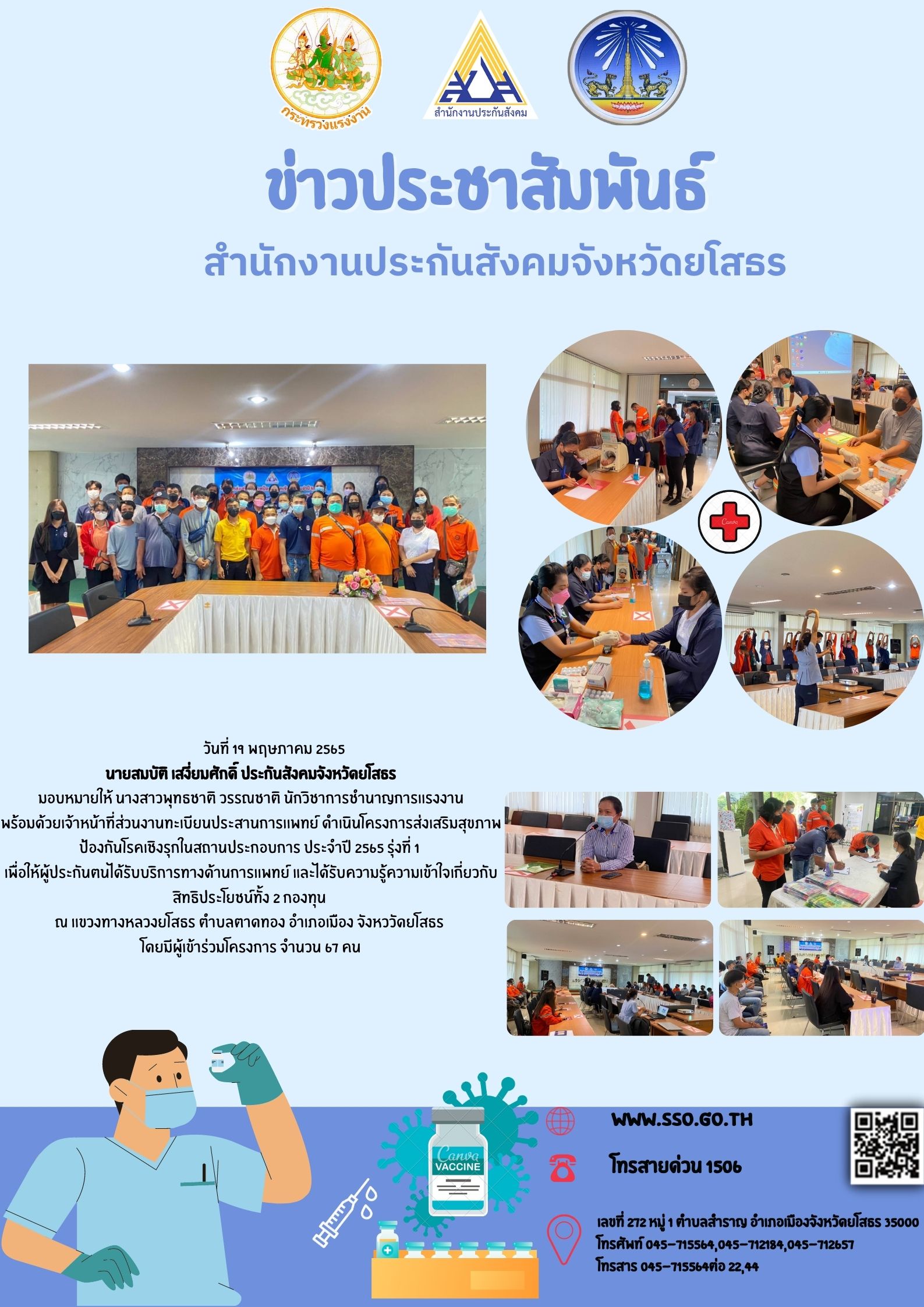ที่ 19 พฤษภาคม 2565 นายสมบัติ เสงี่ยมศักดิ์ ประกันสังคมจังหวัดยโสธร มอบหมายให้ เจ้าหน้าที่ส่วนงานทะเบียนและประสานการเเพทย์ จัดโครงการส่งเสริมสุขภาพป้องกันโรคเชิงรุก ประจำปี 2565 รุ่งที่ 1