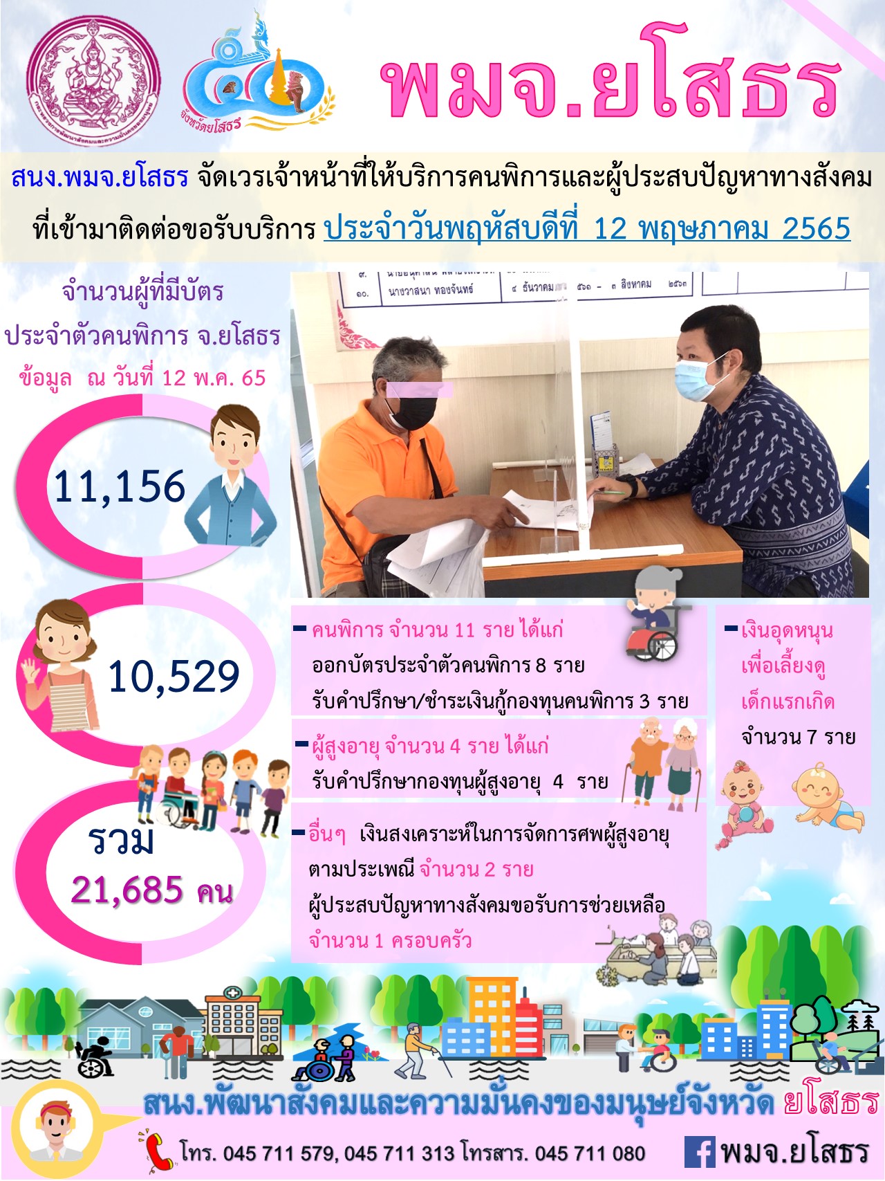 สนง.พมจ.ยโสธร จัดเวรเจ้าหน้าที่ให้บริการคนพิการและผู้ประสบปัญหาทางสังคม ที่เข้ามาติดต่อขอรับบริการ (12 พฤษภาคม 2565)