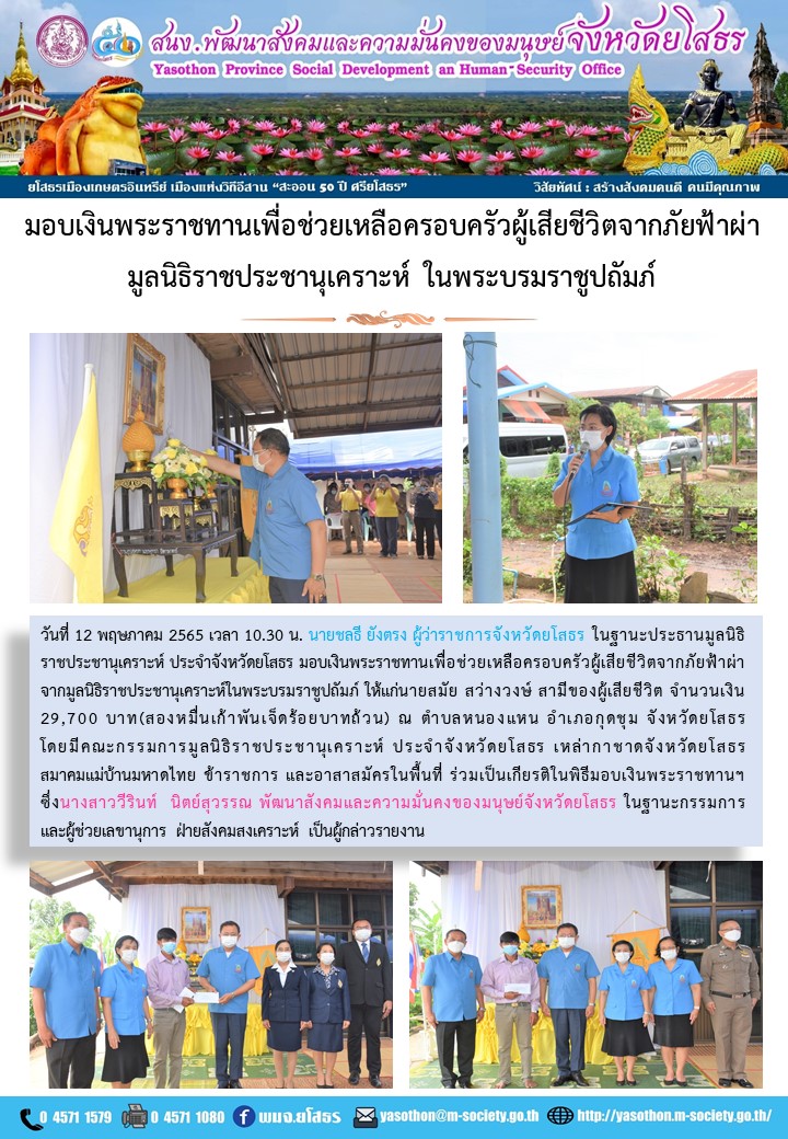 มอบเงินพระราชทานเพื่อช่วยเหลือครอบครัวผู้เสียชีวิตจากภัยฟ้าผ่า จากมูลนิธิราชประชานุเคราะห์ ในพระบรมราชูปถัมภ์ (12 พฤษภาคม 2665)