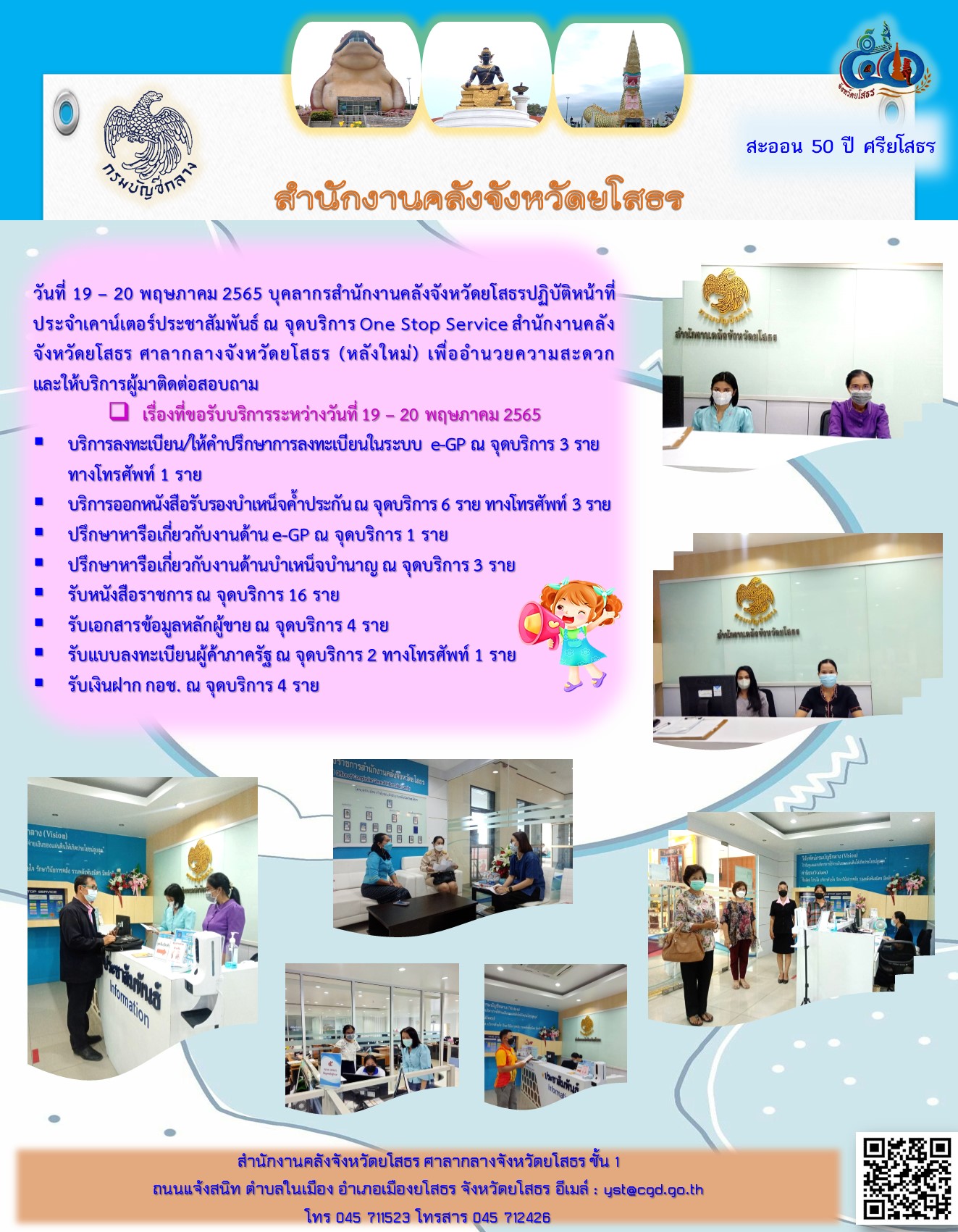 วันที่ 19 – 20 พฤษภาคม 2565 บุคลากรสำนักงานคลังจังหวัดยโสธรปฏิบัติหน้าที่ประจำเคาน์เตอร์ประชาสัมพันธ์ ณ จุดบริการ One Stop Service สำนักงานคลังจังหวัดยโสธร ศาลากลางจังหวัดยโสธร (หลังใหม่) เพื่ออำนวยความสะดวกและให้บริการผู้มาติดต่อสอบถาม
