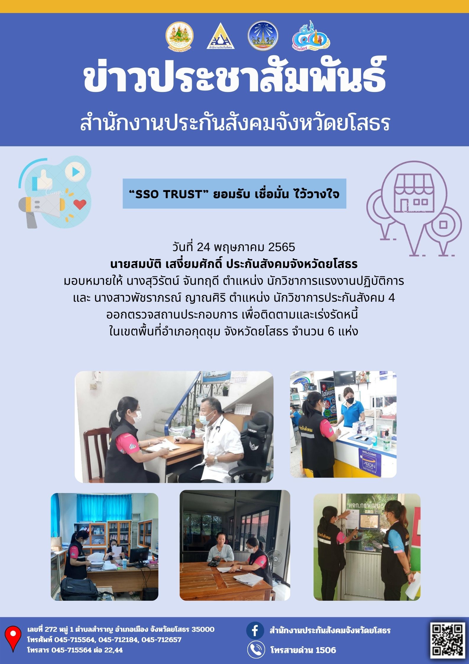 วันที่ 24 พฤษภาคม 2565 นายสมบัติ เสงี่ยมศักดิ์ ประกันสังคมจังหวัดยโสธร มอบหมายให้เจ้าหน้าที่ส่วนงานเงินสมทบและตรวจสอบ ออกตรวจสถานประกอบการ เพื่อติดตามและเร่งรัดหนี้