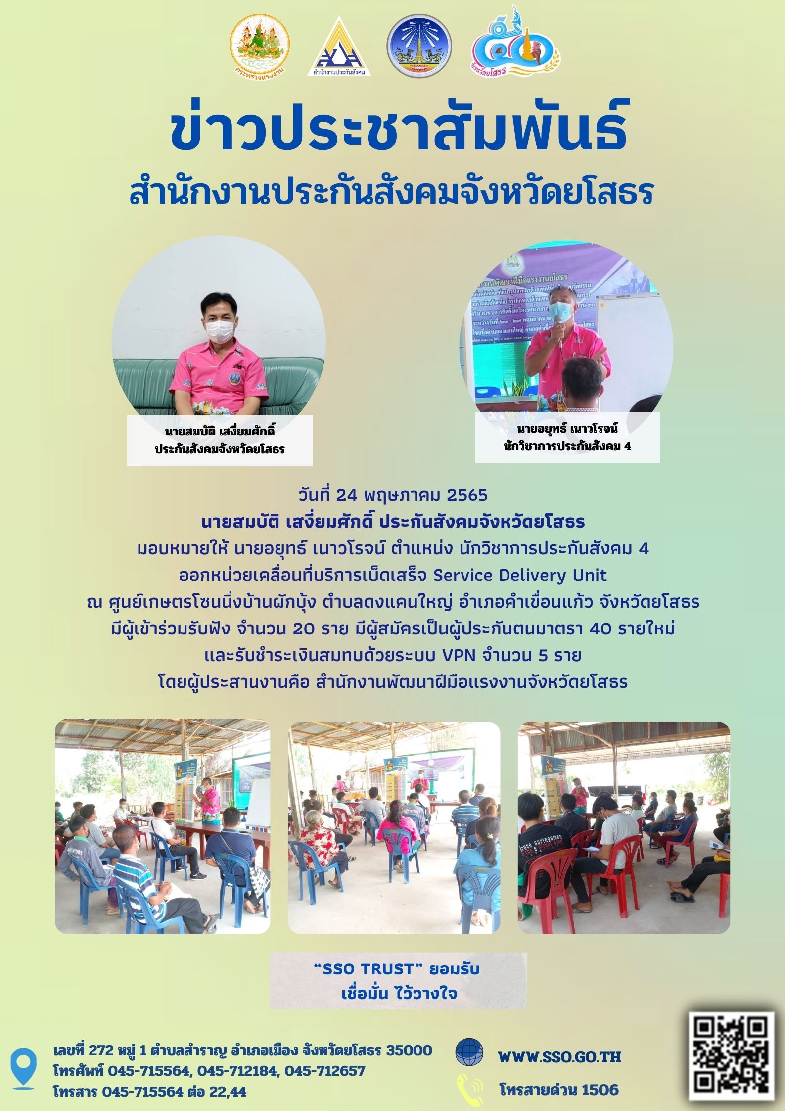 วันที่ 24 พ.ค. 2565 (18:12 น.)วันที่ 24 พฤษภาคม 2565 นายสมบัติ เสงี่ยมศักดิ์ ประกันสังคมจังหวัดยโสธร