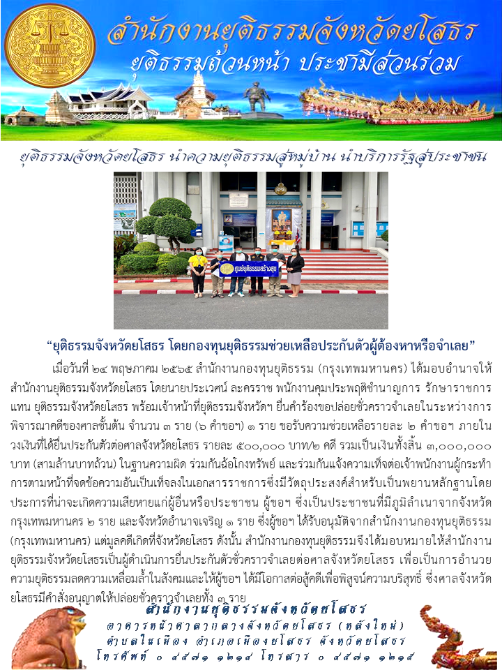 “ยุติธรรมจังหวัดยโสธร โดยกองทุนยุติธรรมช่วยเหลือประกันตัวผู้ต้องหาหรือจำเลย”