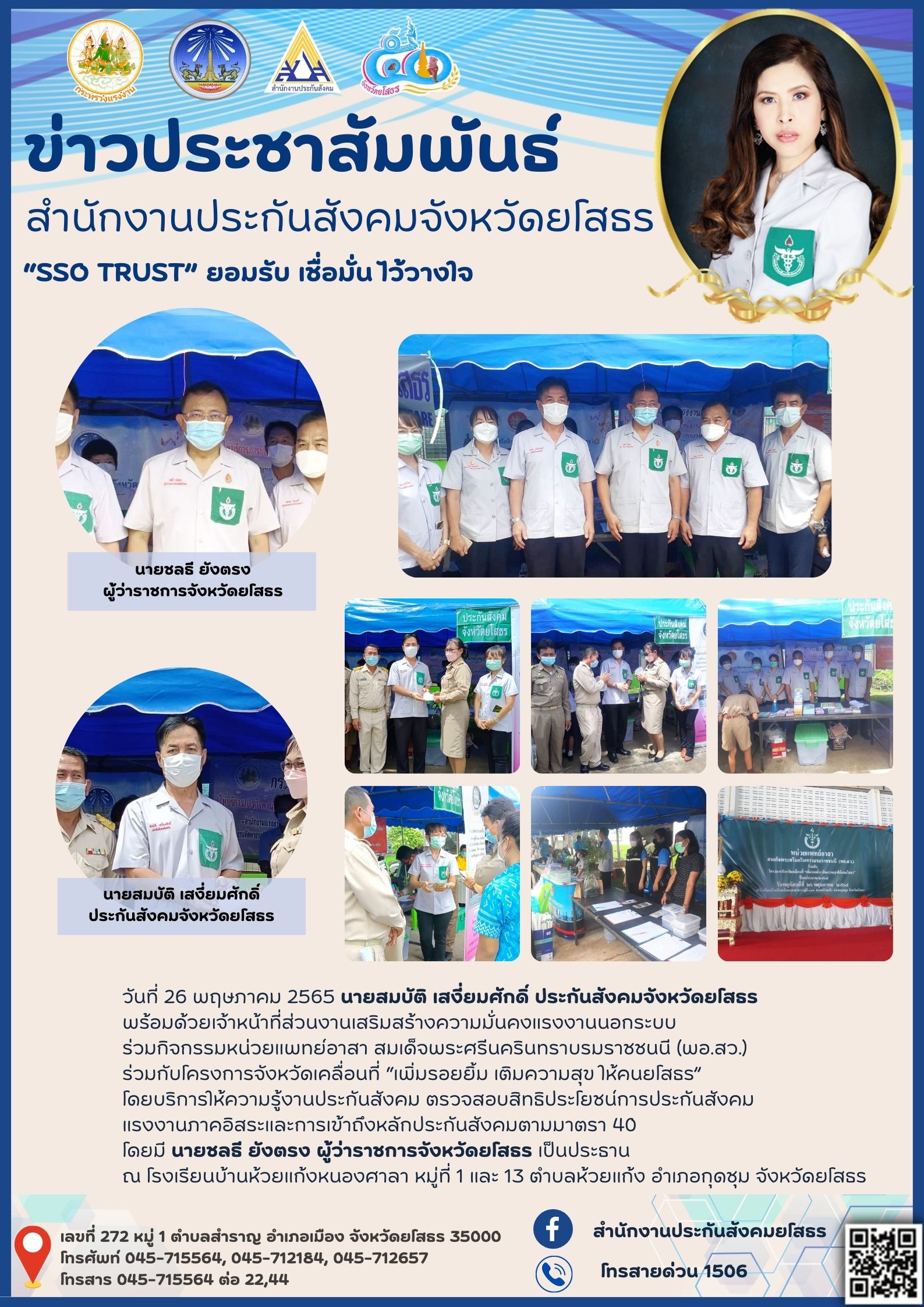 วันที่ 26 พ.ค. 2565 (17:10 น.)วันที่ 26 พฤษภาคม 2565 นายสมบัติ เสงี่ยมศักดิ์ ประกันสังคมจังหวัดยโสธร