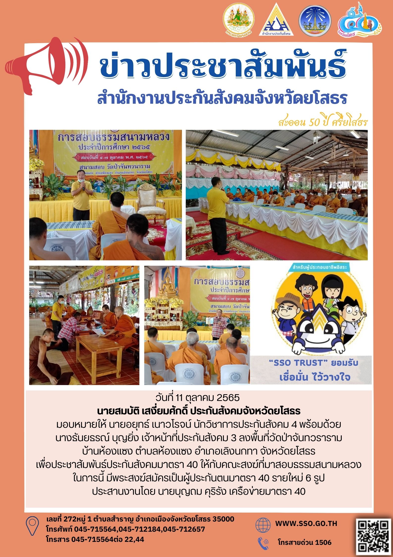 วันที่ 26 พ.ค. 2565 (17:34 น.)วันที่ 26 พฤษภาคม 2565 นายสมบัติ เสงี่ยมศักดิ์ ประกันสังคมจังหวัดยโสธร