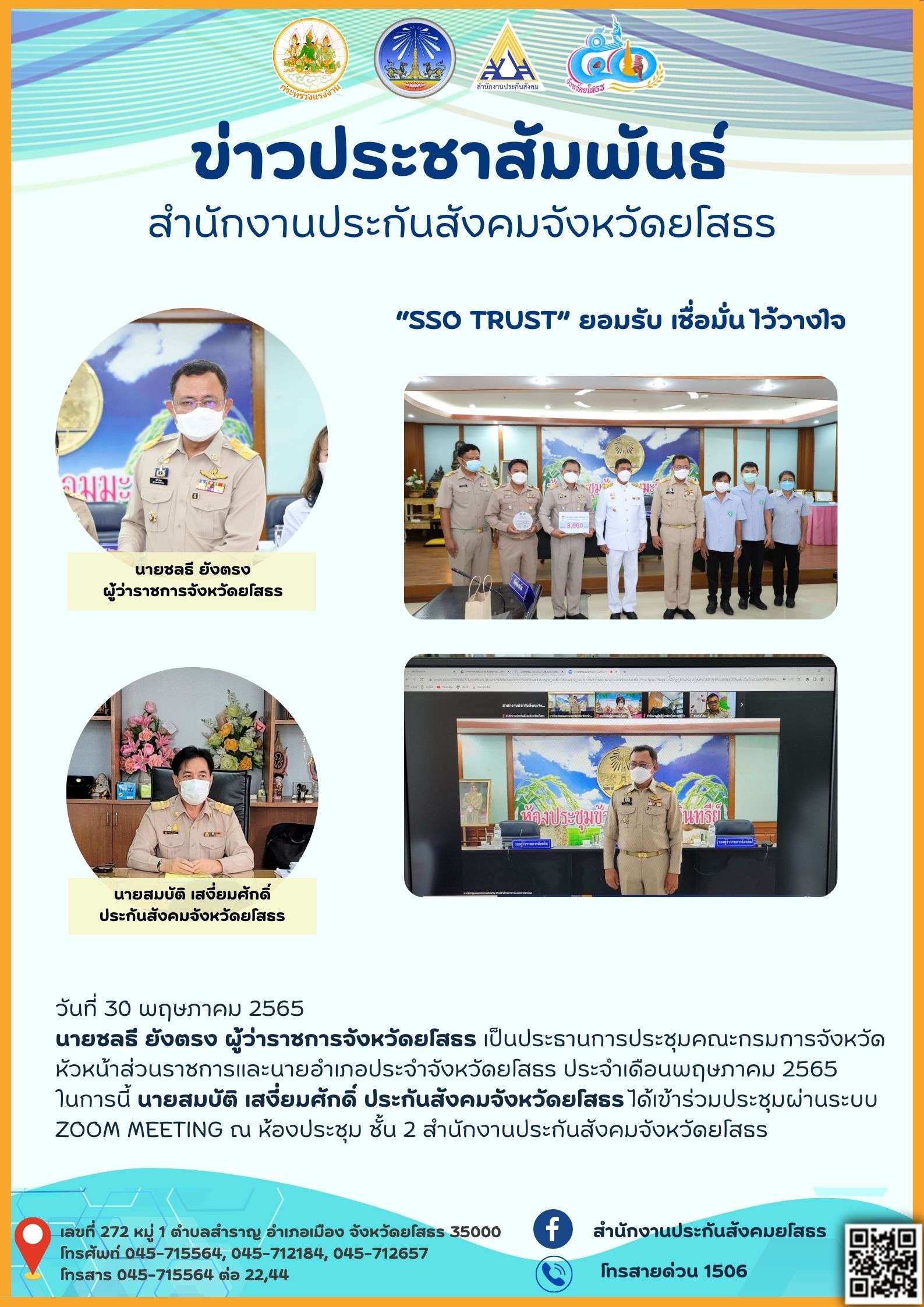 วันที่ 30 พฤษภาคม 2565 นายสมบัติ เสงี่ยมศักดิ์ ประกันสังคมจังหวัดยโสธร เข้าร่วมประชุมคณะกรมการจังหวัดยโสธร ประจำเดือน พ.ค. 65