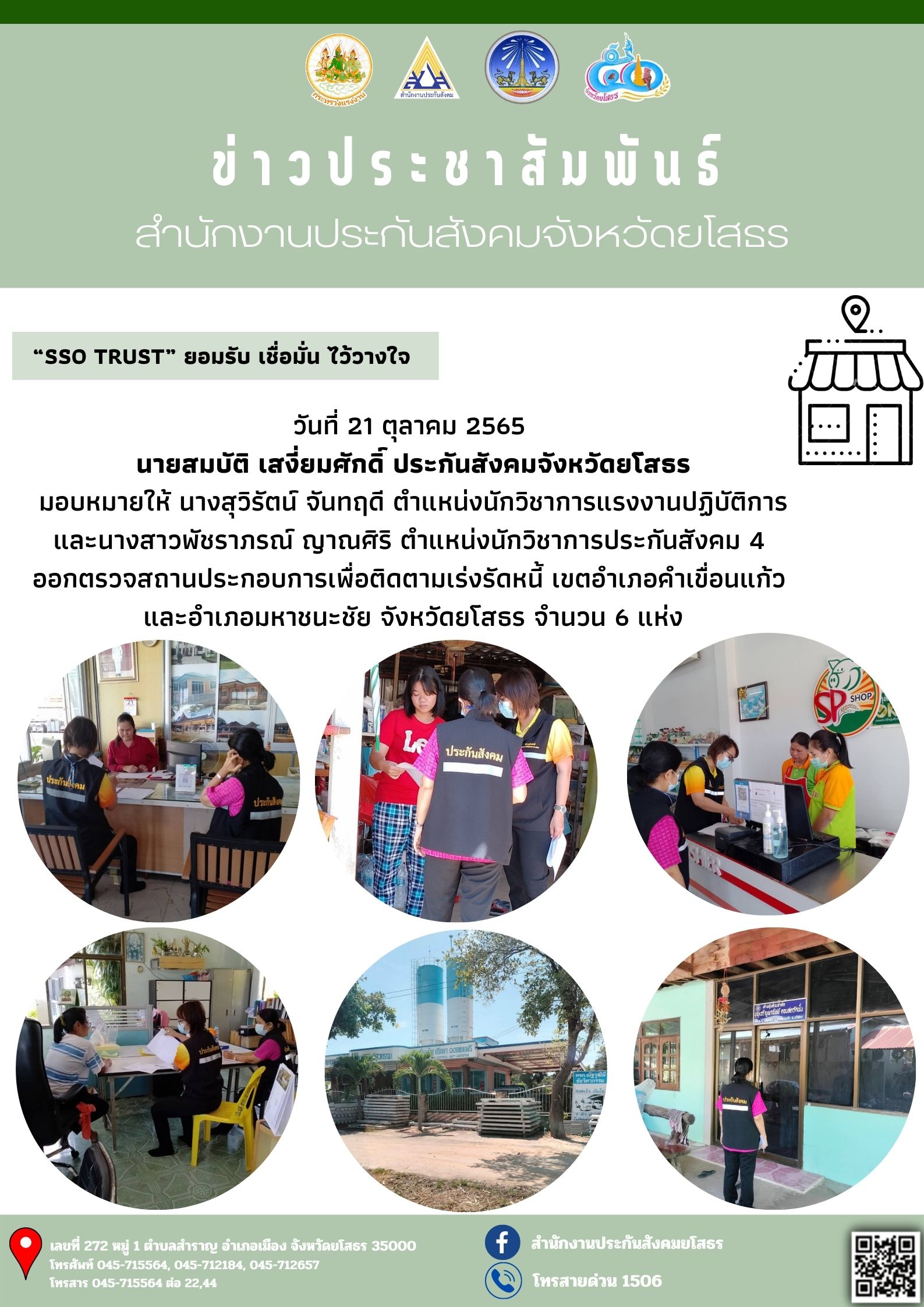 วันที่ 30 พฤษภาคม 2565 นายสมบัติ เสงี่ยมศักดิ์ ประกันสังคมจังหวัดยโสธร มอบหมายให้ นางพิศมัย ยศไตรศรีวิรัตน์ ตำแหน่ง นักวิชาการเงินและบัญชีชำนาญการ พร้อมเจ้าหน้าที่ส่วนงานเสริมสร้างความมั่นคงแรงงานนอกระบบ ออกหน่วยเคลื่อนที่บริการเบ็ดเสร็จ SERVICE DELI