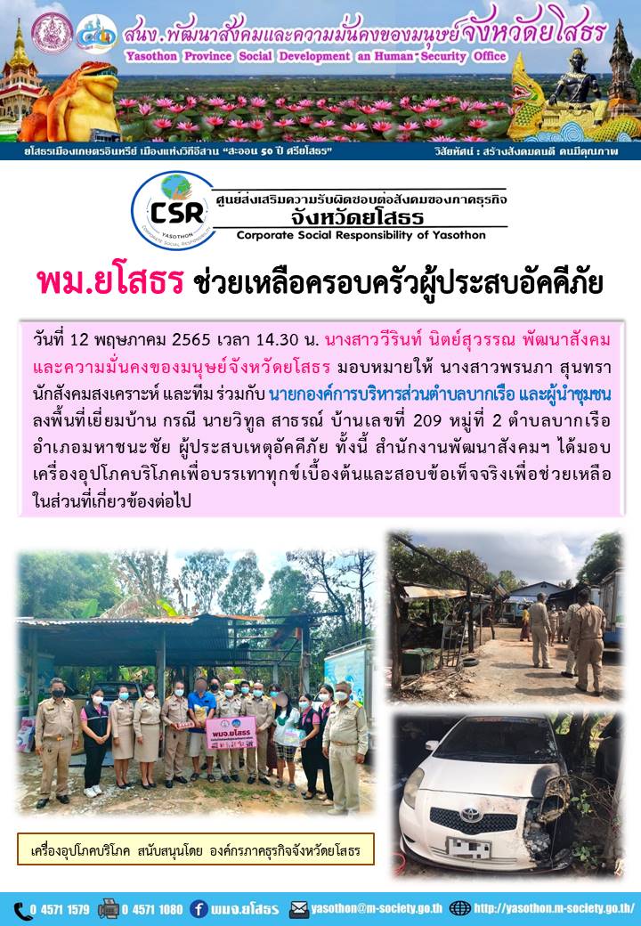 พม.ยโสธร ช่วยเหลือครอบครัวผู้ประสบอัคคีภัย (12 พฤษภาคม 2565)
