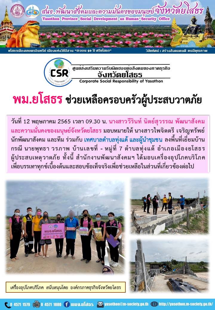 พม.ยโสธร ช่วยเหลือครอบครัวผู้ประสบวาตภัย (12 พฤษภาคม 2565)