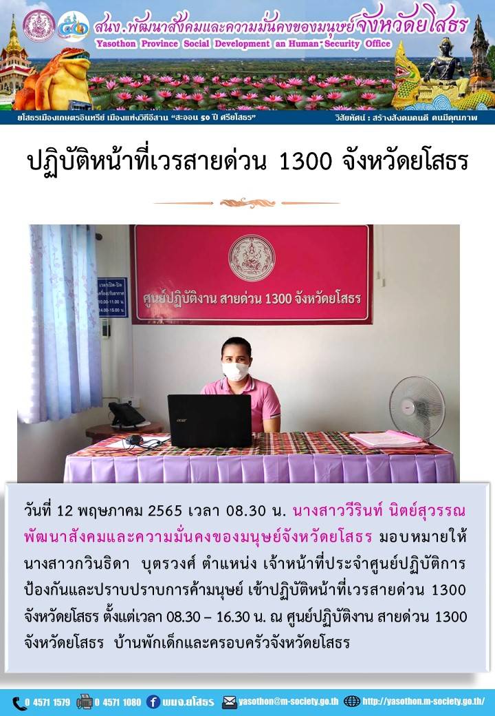 ปฏิบัติหน้าที่เวรประจำวันสายด่วน 1300 จังหวัดยโสธร (12 พฤษภาคม 2565)