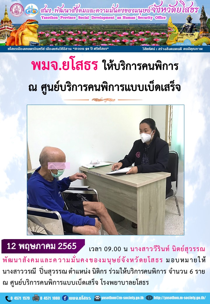 พมจ.ยโสธร ให้บริการคนพิการ ณ ศูนย์บริการคนพิการแบบเบ็ดเสร็จ (12 พฤษภาคม 2565)