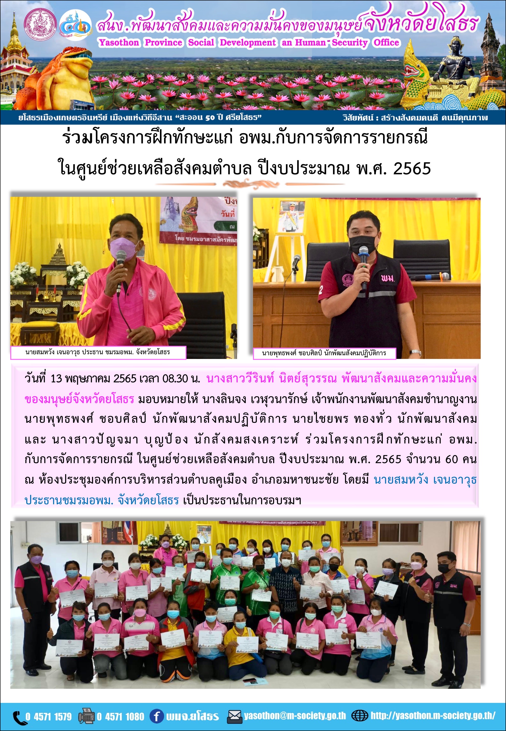 ร่วมโครงการฝึกทักษะแก่ อพม.กับการจัดการรายกรณี ในศูนย์ช่วยเหลือสังคมตำบล ปีงบประมาณ พ.ศ. 2565 (13 พฤษภาคม 2565)