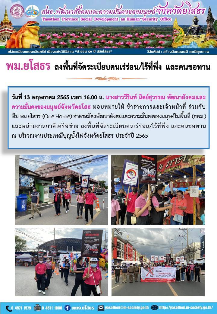 วันที่ 30 พ.ค. 2565 (20:41 น.)วันที่ 13 พฤษภาคม 2565 เวลา 16.00 น. นางสาววีรินท์ นิตย์สุวรรณ พัฒนาสังคมและความมั่นคงของมนุษย์จังหวัดยโสธ มอบหมายให้ ข้าราชการและเจ้าหน้าที่ ร่วมกับ ทีม พม.ยโสธร (One Home) อาสาสมัครพัฒนาสังคมและความมั่นคงของมนุษย์ (อพม.) และหน่วยงานภาคีเครือข่าย ลงพื้นที่จัดระเบียบคนเร่ร่อน/ไร้ที่พึ่ง และคนขอทาน ณ บริเวณงานประเพณีบุญบั้งไฟจังหวัดยโสธร ประจำปี 2565