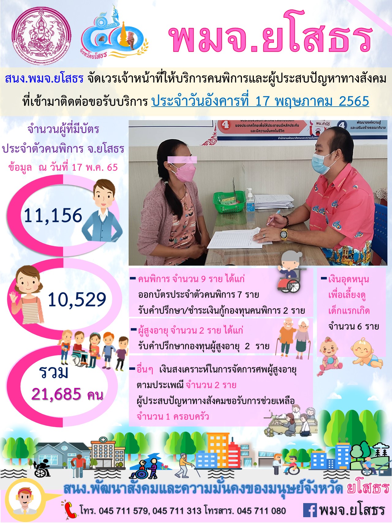 สนง.พมจ.ยโสธร จัดเวรเจ้าหน้าที่ให้บริการคนพิการและผู้ประสบปัญหาทางสังคม ที่เข้ามาติดต่อขอรับบริการ (17 พฤษภาคม 2565)