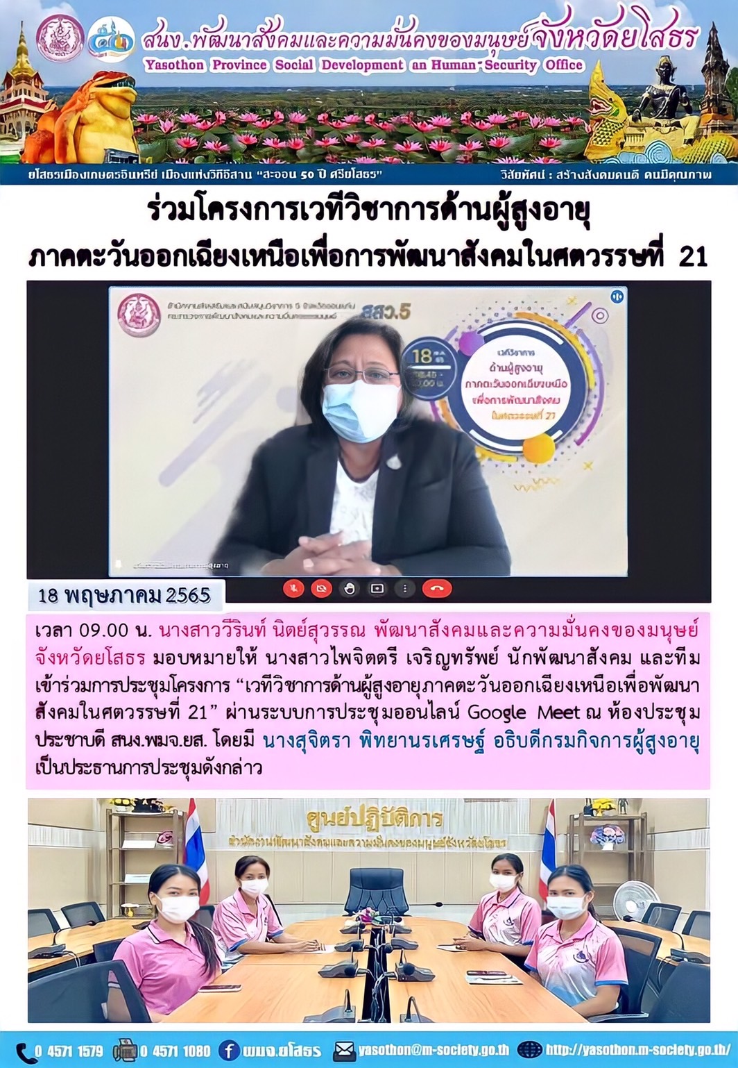 วันที่ 30 พ.ค. 2565 (20:54 น.)วันที่ 18 พฤษภาคม 2565 เวลา 09.00 น. นางสาววีรินท์ นิตย์สุวรรณ พัฒนาสังคมและความมั่นคงของมนุษย์จังหวัดยโสธร มอบหมายให้ นางสาวไพจิตตรี เจริญทรัพย์ นักพัฒนาสังคม และทีม เข้าร่วมการประชุมโครงการ "เวทีวิชาการด้านผู้สูงอายุภาคตะวันออกเฉียงเหนือเพื่อพัฒนาสังคมในศตวรรษที่ 21" ผ่านระบบการประชุมออนไลน์ Google Meet ณ ห้องประชุมประชาบดี สนง.พมจ.ยส. โดยมี นางสุจิตรา พิทยานรเศรษฐ์ อธิบดีกรมกิจการผู้สูงอายุ เป็นประธานการประชุมดังกล่าว